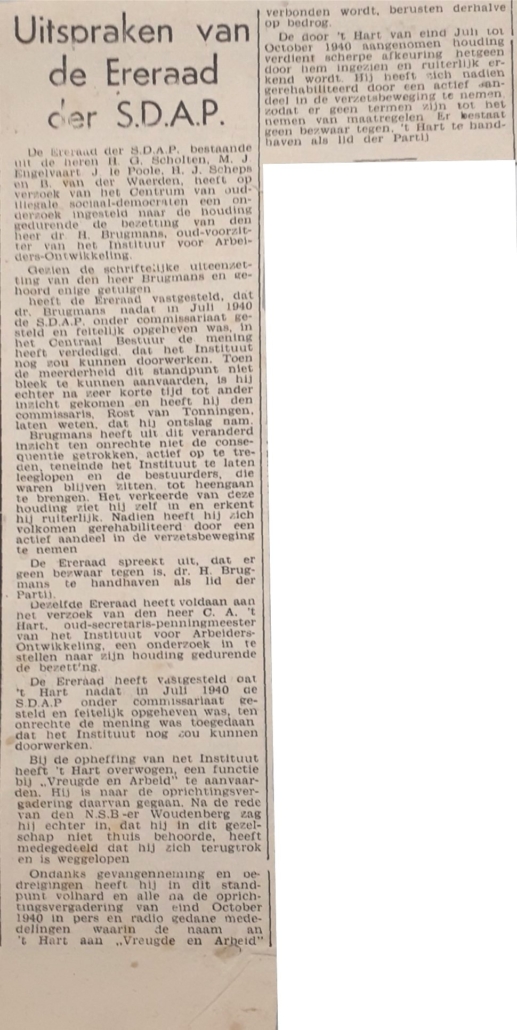Eén van de laatste stukken in het archief betreft de grootse viering van zijn 75ste verjaardag in 1966 met een feestelijke, doch stichtelijke rede van de jarige zelf. Hij kijkt daarin terug op zijn vele, bestuurlijke taken in de sociaaldemocratische beweging. Hij zag het als een voorrecht om hier actief in te zijn. Maar over de toekomst ervan maakt hij zich zorgen. Graag zou hij daar zijn schouders onder zetten. Want, waarschuwend voor de “degenererende verburgerlijking”, waar en hoe kan en moet de beweging bij de toenemende politieke emancipatie van de arbeiders en de groeiende welvaart versterkt worden? Dat bleef zijns inziens een eigen strijdvaardige culturele beweging, met blijvende aandacht voor vernieuwing, voor de jeugd dus.