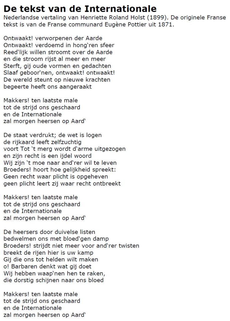 Jan Kooijman beschrijft in zijn boekje “De Internationale: een fel bewogen strijdlied” (Nivon Federatie Rotterdam, 1989) de ontstaansgeschiedenis van het lied de Internationale. De tekst van het lied werd als gedicht geschreven door Eugène Poittier in 1864 en op muziek gezet in 1888 door Pierre Degeyter. De meest gebruikte Nederlandse bewerking is van dichteres Henriëtte Roland Holst. Deze tekst is hier te vinden en de door het koor “De stem des volks” gezongen versie is hieronder te beluisteren. Minder bekende vertalingen zijn van Jaap v.d. Merwe en Rob v.d. Meeberg. Meer informatie over het lied is te vinden op Wikipedia. Reden waarom we het lied in dit kader noemen is omdat, zoals Jan Kooijman aan het eind van zijn boekje vermeldt, het in bijna alle landen wordt gezongen op 1 mei. Luister maar, ik krijg er nog altijd kippenvel van!