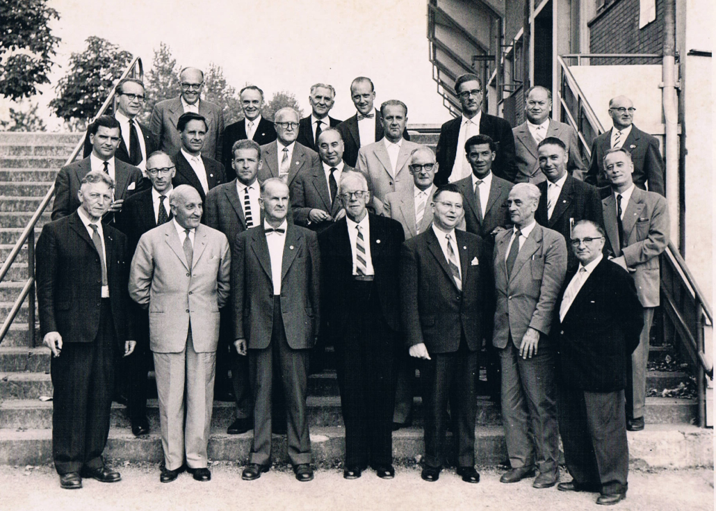 Deelnemers aan het NaturFreunde Internationale (NFI) congres 1959 in Nederland. Bovenste rij derde van rechts Ad de Vrankrijker, vierde van rechts Wim Huslage, voorste rij eerste van links Kees de Boer. Fotograaf onbekend.